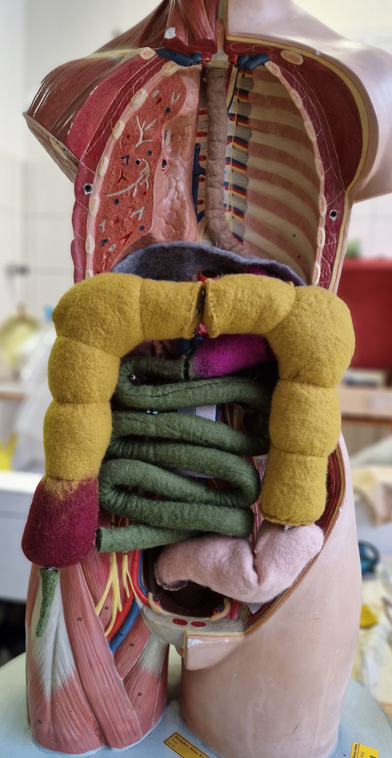 Und so kam die Idee, dass ich doch beide Welten – Anatomie und Filz, Schule und Werkstatt (Verbindung Nr. 2 und 3) – miteinander verbinden könnte. Heraus kam dieser befilzte Torso, bei dem Teile der Organe „operabel“ sind, so dass in 3D von unseren Azubis erlebt werden kann, was bei einer OP der Viszeralchirurgie möglich ist.