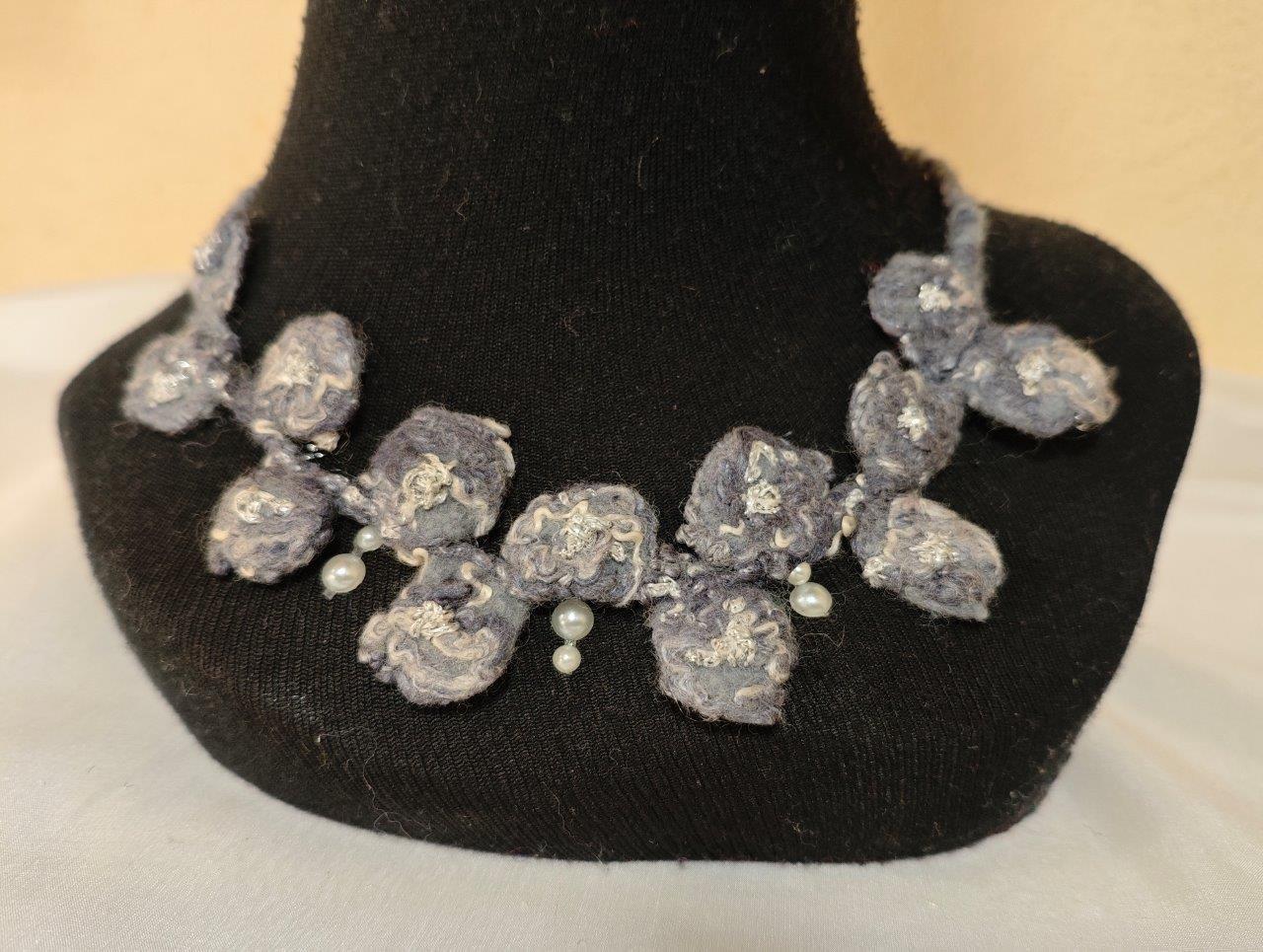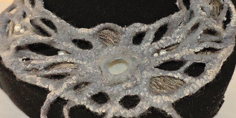 Anhand kleiner, feiner Projekte vermittelt dieser Kurs Einblicke in die Spitzenfilztechnik. Wir fertigen Schmuckstücke mit Gold – und Silbereffekten, hauchzart gefilzt als Collier, Armband oder Kopfschmuck.