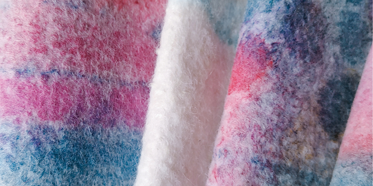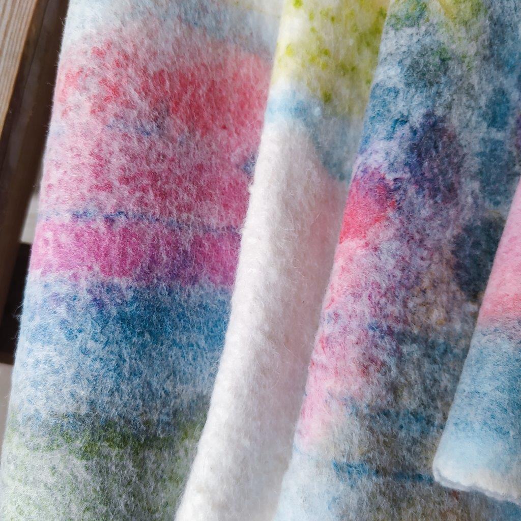 Auch der umgekehrte Weg bietet interessante Möglichkeiten: Zunächst wird ein Seidenstoff nach Wunsch bemalt, die Farbe fixiert. Dieses individuelle Stück Seidenmalerei wird anschließend eingefilzt. Die Durchdringung von Seide und Wolle beim Nunofilzen bringt interessante Strukturen und Farbwirkungen hervor.