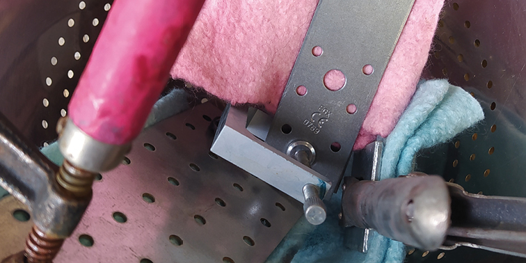 Im Mittelpunkt des Kurses steht das Ausprobieren verschiedener Reservierungstechniken und -hilfsmittel. Denn die Filzobjekte werden nicht einfach in ein Farbbad getaucht, sondern vorher behandelt, um Bereiche zu „reservieren“, die von der Farbe nicht erreicht werden. So entstehen Muster: Indem wir den Filz falten und mit verschiedenen Garnen abbinden, ihn zwischen Metallteilen wie Schraubzwingen oder Locheisen einklemmen … Gerne kann mitgebracht werden, was die Heimwerkerwerkstatt oder der Baumarkt hergeben – es sollte nur in den Färbetopf passen.
