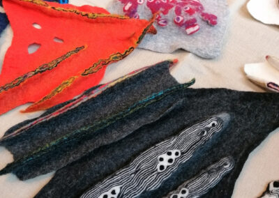 An diesem Wochenende blieb bewusst viel freie Zeit. Zeit zum Vertiefen, zum Weiterdenken und zum Austausch, denn genau hier entfaltet die Filzbegegnung ihre besondere Qualität. Gespräche durften entstehen, Kontakte vertieften sich und Ideen wuchsen weiter. Die anwesenden Wollhändler ermöglichten spontane Entdeckungen, sodass neue Impulse unmittelbar umgesetzt werden konnten.